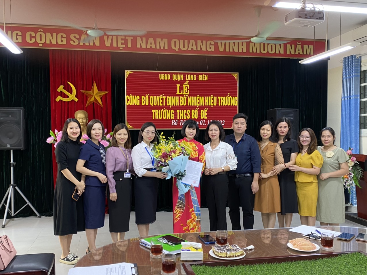 Sáng ngày 01/11/2022, Phòng Nội vụ, phòng GD&ĐT quận Long Biên long trọng tổ chức lễ công bố Quyết định bổ nhiệm chức danh Hiệu trưởng Trường THCS Bồ Đề. Tham dự có bà Nguyễn Thị Thu Hằng - QUV, Trưởng phòng Nội vụ; bà Dương Kiều Ngọc Loan - Phó trưởng phòng Nội vụ; bà Đào Thị Hoa - Phó trưởng phòng GD&ĐT; ông Trần Mạnh Tuấn - Phó chủ tịch UBND phường Bồ Đề cùng toàn thể Ban Giám hiệu, các đồng chí trong Ban Liên tịch của Trường THCS Bồ Đề.