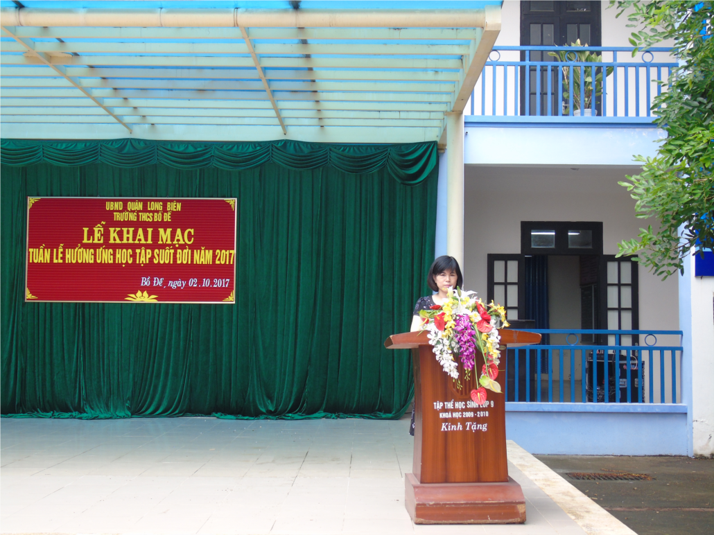Thực hiện công văn của SGD, của UBND quận Long Biên và phòng GD ĐT Long Biên. Sáng 2/10/2017 trường THCS Bồ Đề tổ chức khai mạc tuần lễ hưởng ứng học tập suôt đời năm 2017 với chủ đề “Học tập để hoàn thiện nhân cách, phát triển bản thân”.