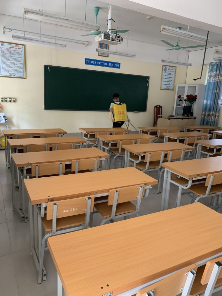 Theo yêu cầu của công tác khử trùng, toàn bộ các lớp học, hệ thống cửa, các phòng ban chức năng, khu vực hành lang, tay vịn cầu thang, khu vực nhà bếp, các khu sinh hoạt chung của trường đều được lau rửa, sát khuẩn. Đặc biệt trong mỗi lớp học của các em học sinh, công tác lau dọn khử khuẩn được thực hiện vô cùng tỉ mỉ. Từng cốc uống nước, từng khay đựng nước, bình nước, bàn học, ghế ngồi, tủ đựng đồ dùng, đến nền nhà, tay nắm cửa, quạt trần, đều được khử khuẩn kĩ càng.